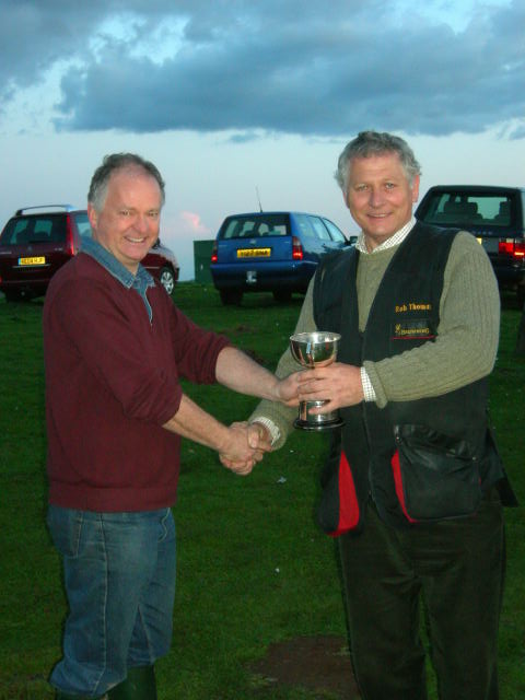 Winner of the Sporting Cup 2008, Rob Thomas receives the trophy from club our President, Nigel Kavanagh. The first competition of the season on Thursday 1st May saw a closely fought contest between brothers, Rob and Richard Thomas. They both finished on 42 ex 50 (very good scores considering the extremely sunny conditions). With the light failing quickly there was no time for a shoot off, so the outcome was decided by the toss of a coin.