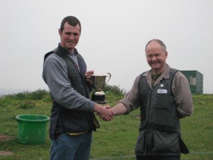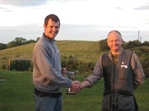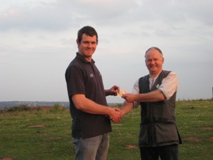 Thursday 25th June 2009 - The Sporting Cup 2009. A fine night brought out a good crowd for the annual Sporting Cup competition. Bob Barnsley, back from holiday, was at his best putting on an excellent 50 bird layout. Good scores were produced by many members and the competition for High Gun was very close; the eventual winner was Greg Thomas (Again!) 48 Ex 50 with Richard Thomas (Again!) just one clay behind him on 47 Ex 50. The winner in Class B was Ray Wesson with a score of 31 Ex 50. The picture shows Greg receiving his prize from club President Nigel Kavanagh.
